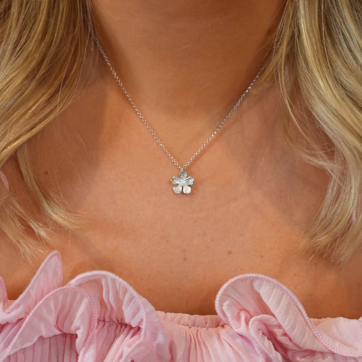 Vackert halsband i 925 rhodinerat silver föreställande tre vackra blommor med gnistrande cz-stenar. Halsband av stilren och unik design som passar för alla tillfällen.
