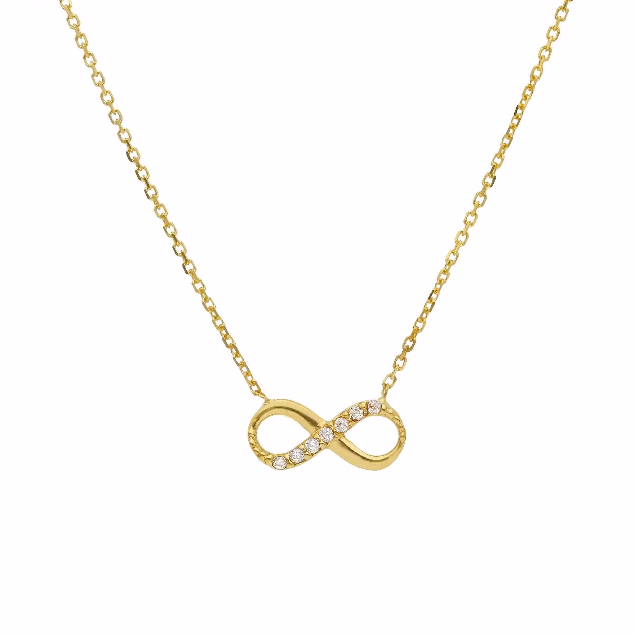 Snyggt och stilrent halsband med evighetstecken i 18K guld. Fylld med gnistrande cz-stenar. Vackert guldhalsband som passar till alla tillfällen.