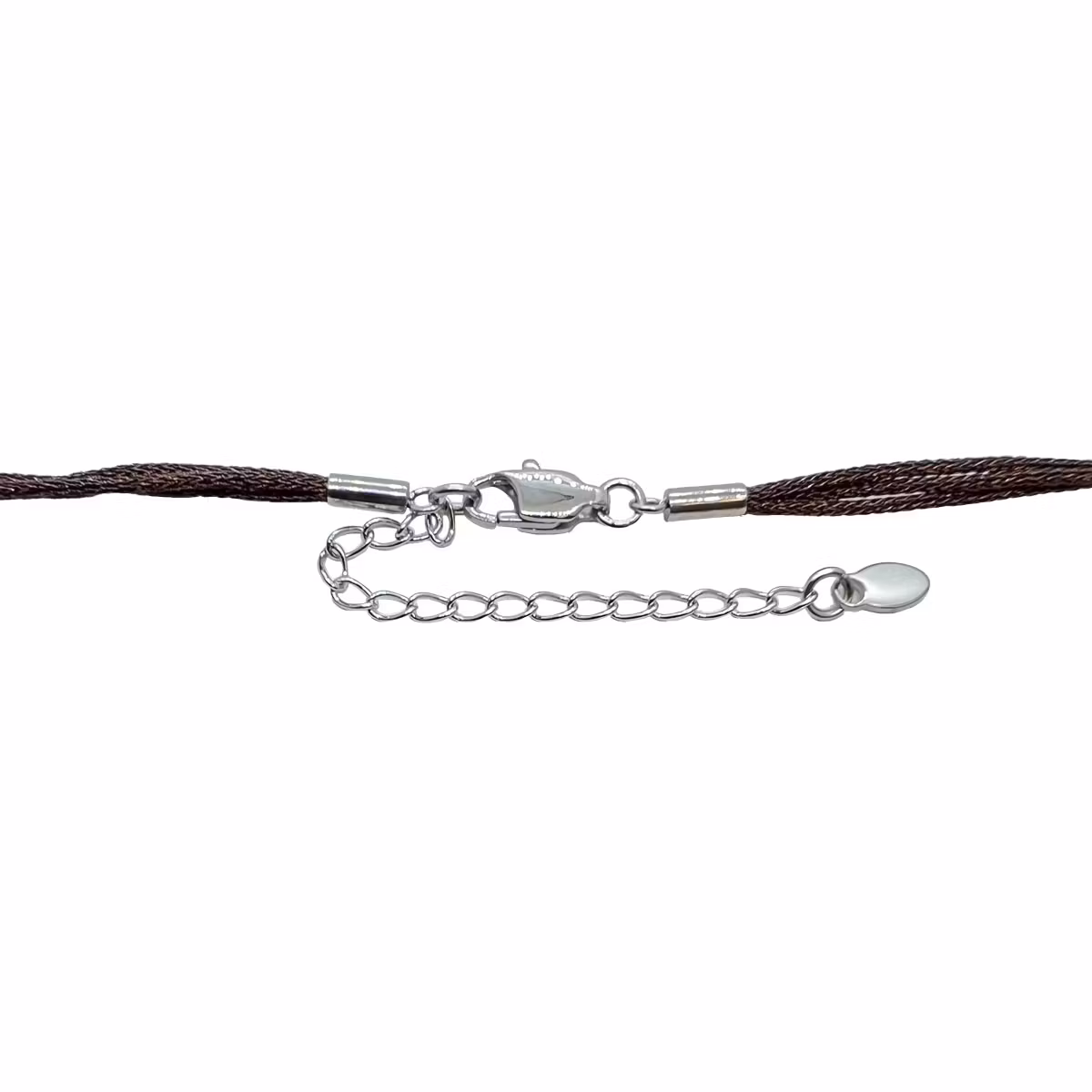 Brunt treradigt silkesband med lås i stål som passar för alla tillfällen, både till vardags och fest. Halsband av stilren och unik design.Mått: 1 mmLängd: 42+5 cm förlängningskedja
