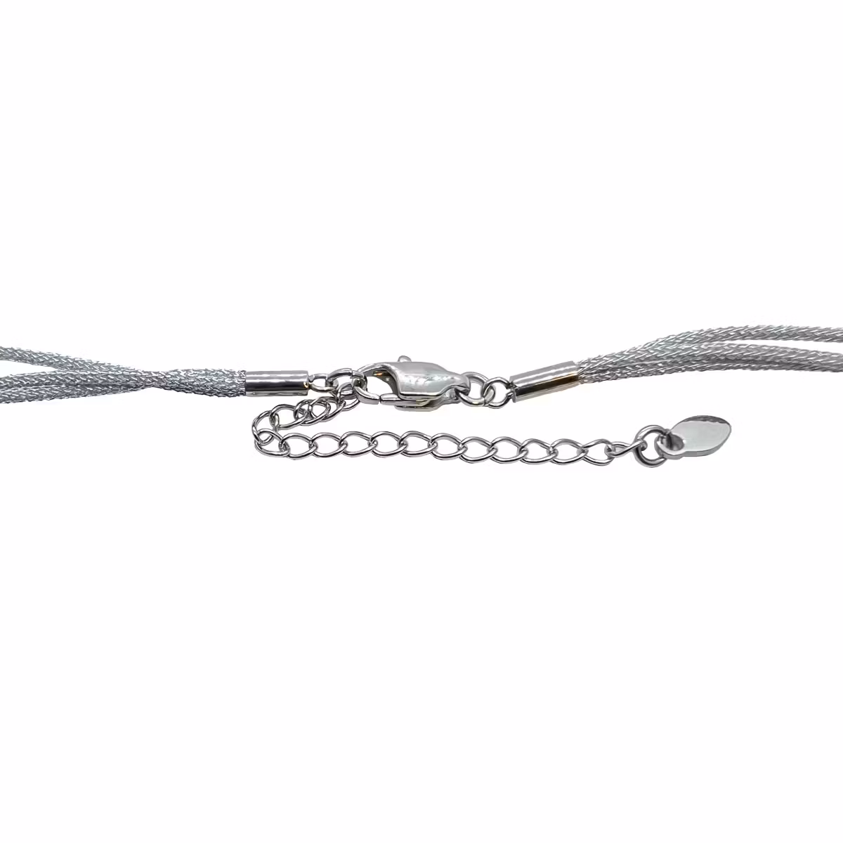 Silverfärgat treradigt silkesband med lås i stål som passar för alla tillfällen, både till vardags och fest. Halsband av stilren och unik design.Mått: 1 mmLängd: 42+5 cm förlängningskedja