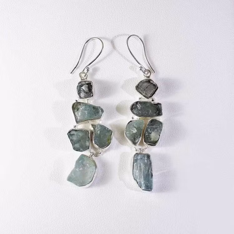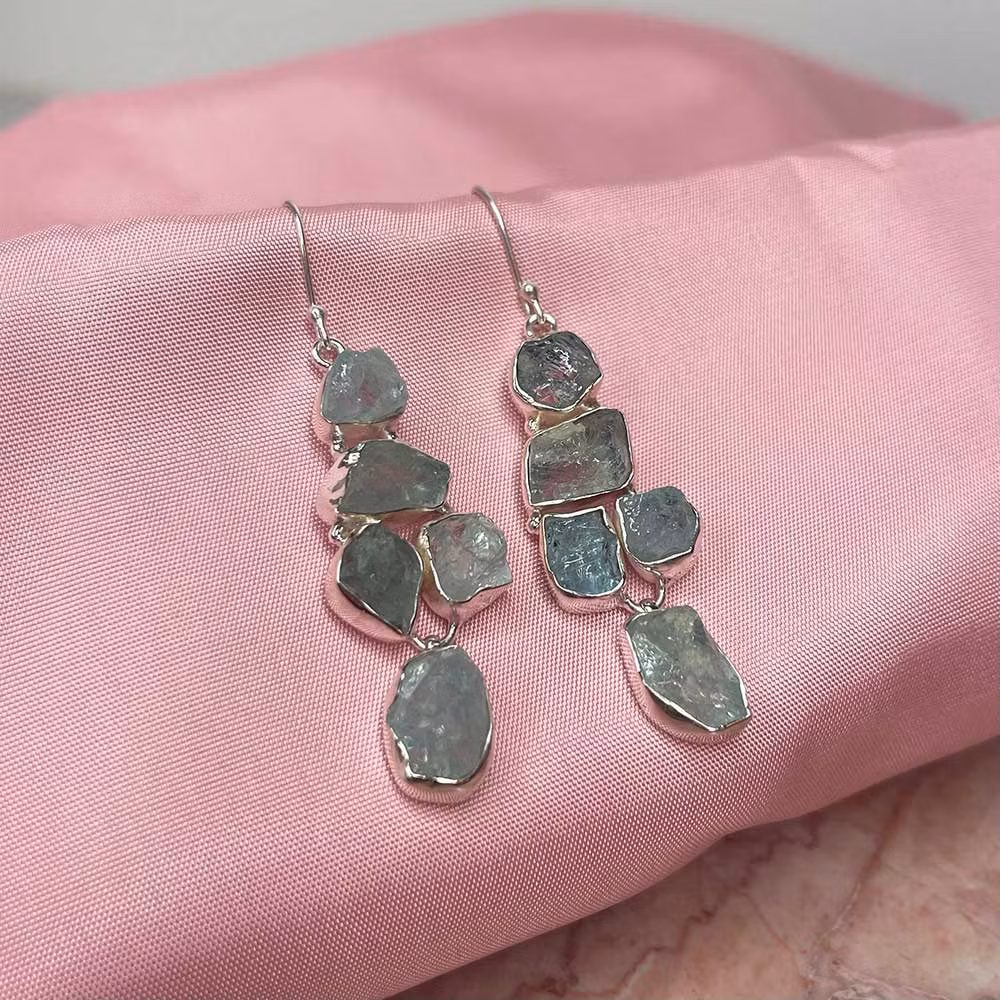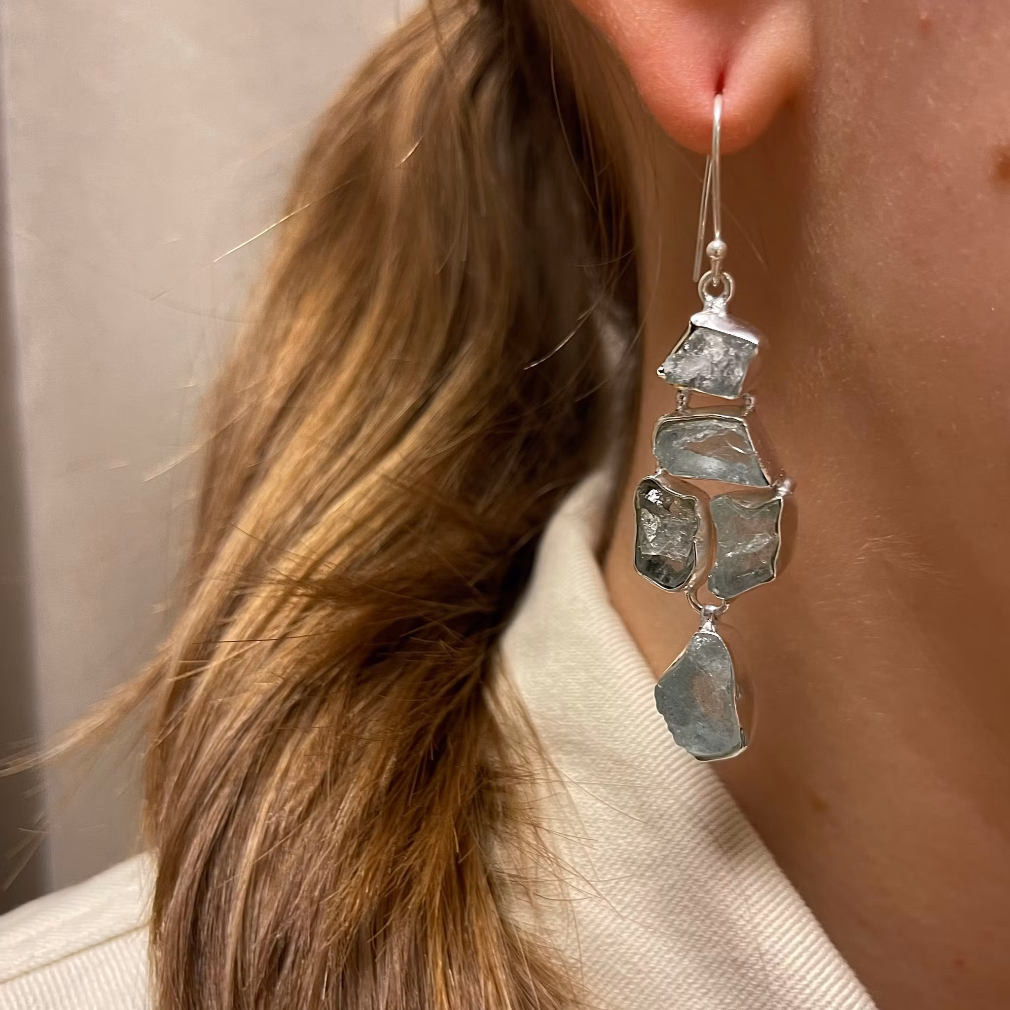 Vackra hängande örhängen i 925 silver med flera varsamt infattade råa Aquamarine ädelstenar. Läckra örhängen av unik och stilren design som passar för alla tillfällen!