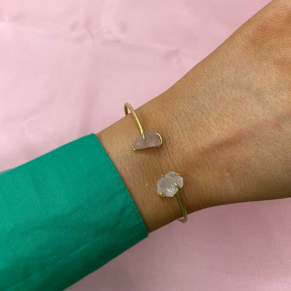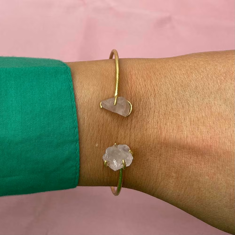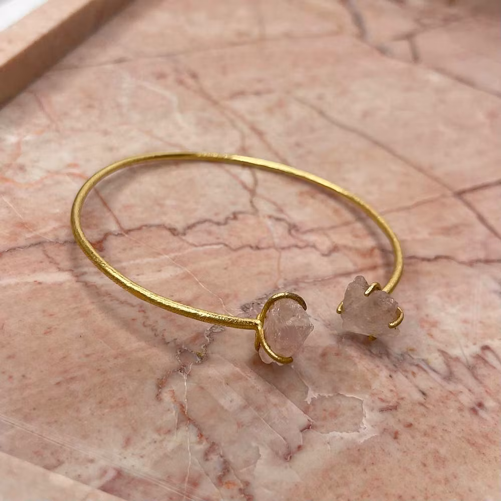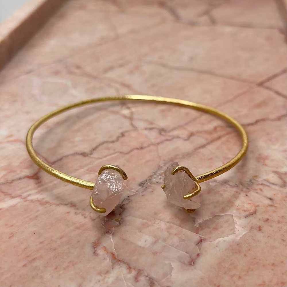 Vacker armring i 925 förgyllt silver med två varsamt infattade råa Rose Quartz ädelstenar. Armring av stilren och unik design som passar för alla tillfällen.
