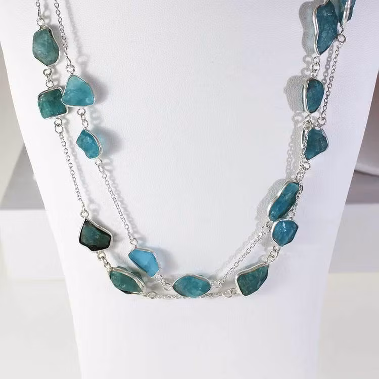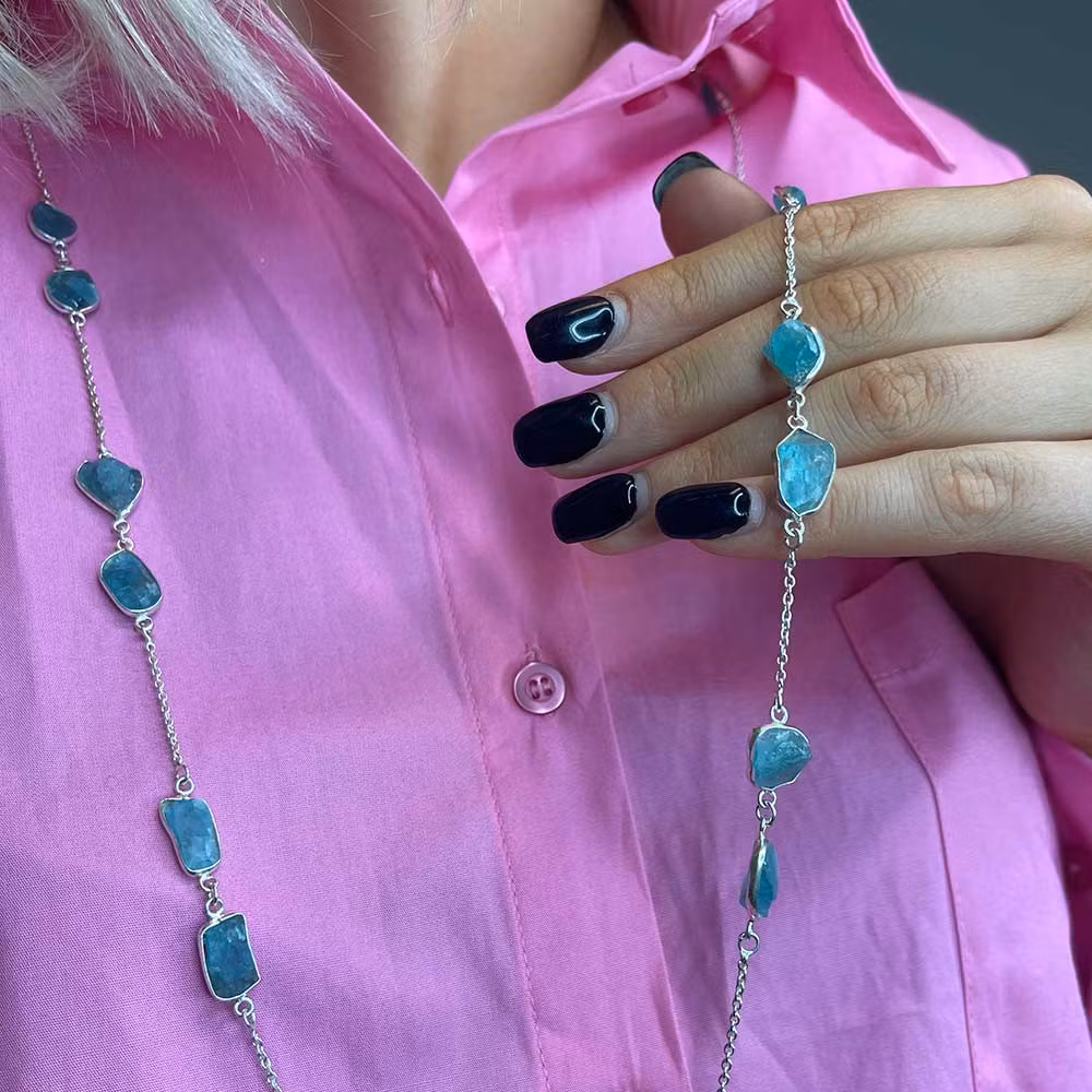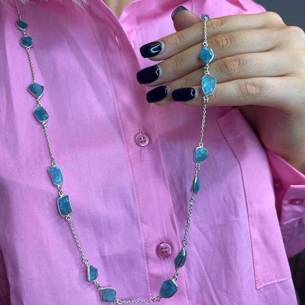 Vackert halsband i 925 silver med varsamt infattade råa Apatite ädelstenar. Stilrent halsband av unik design som passar för alla tillfällen.