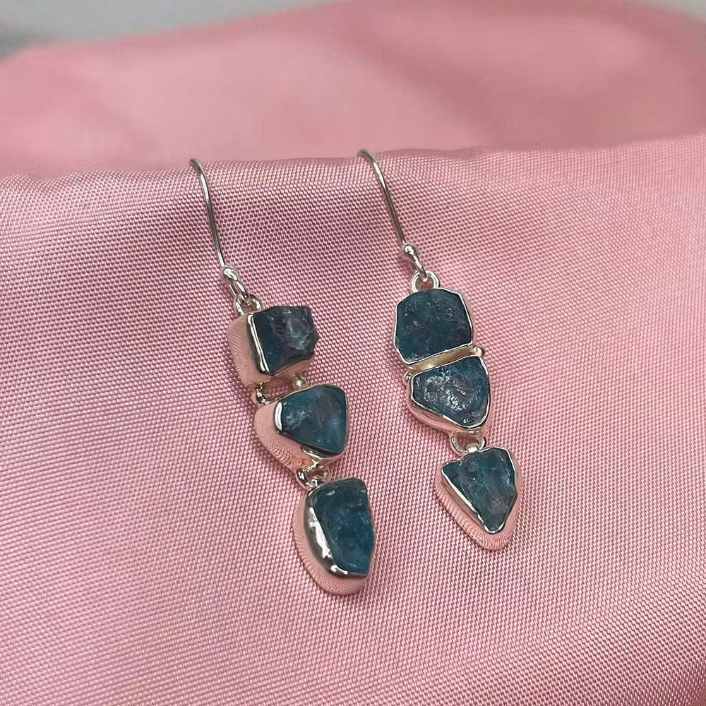 Vackra hängande örhängen i 925 silver med tre varsamt infattade råa Apatite ädelstenar. Läckra örhängen av unik och stilren design som passar för alla tillfällen!