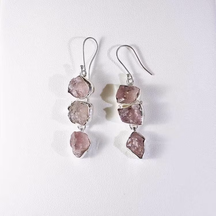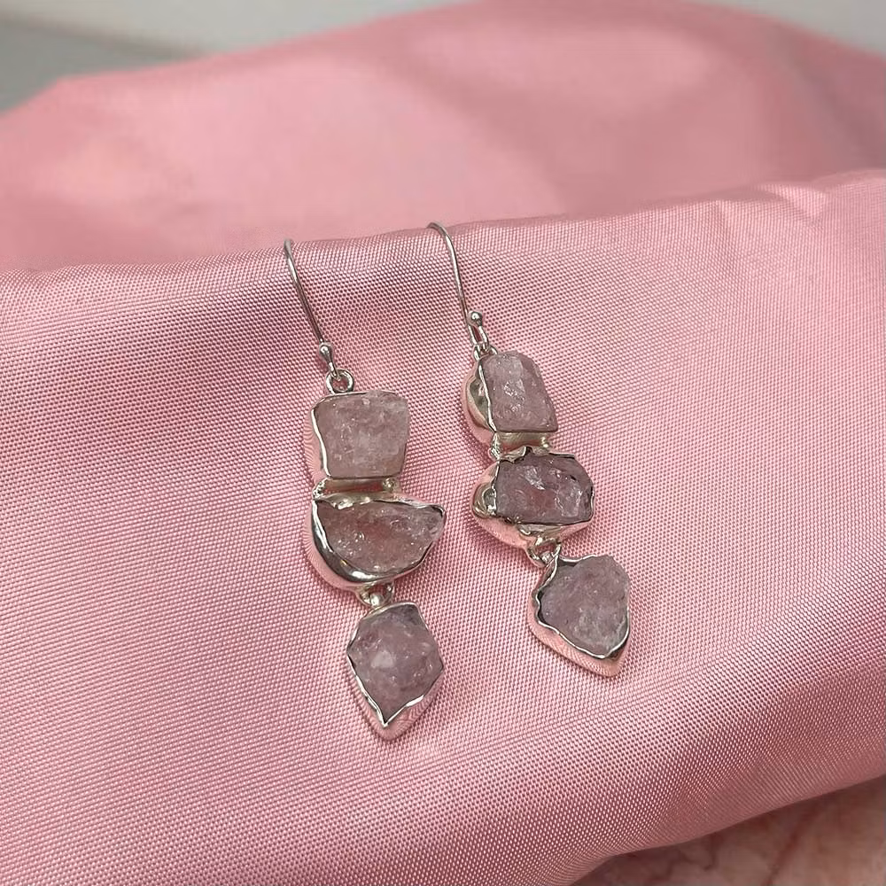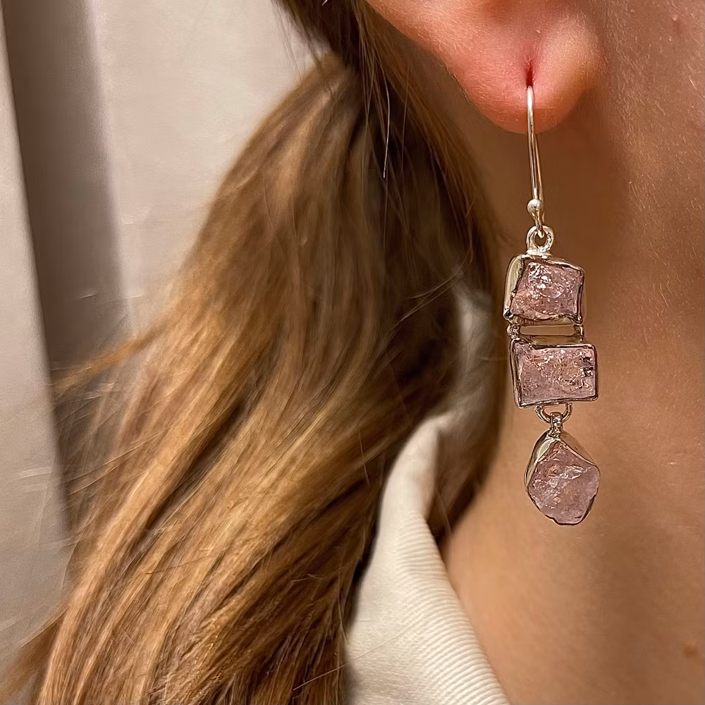 Vackra hängande örhängen i 925 silver med tre varsamt infattade råa Morganite ädelstenar. Läckra örhängen av unik och stilren design som passar för alla tillfällen!