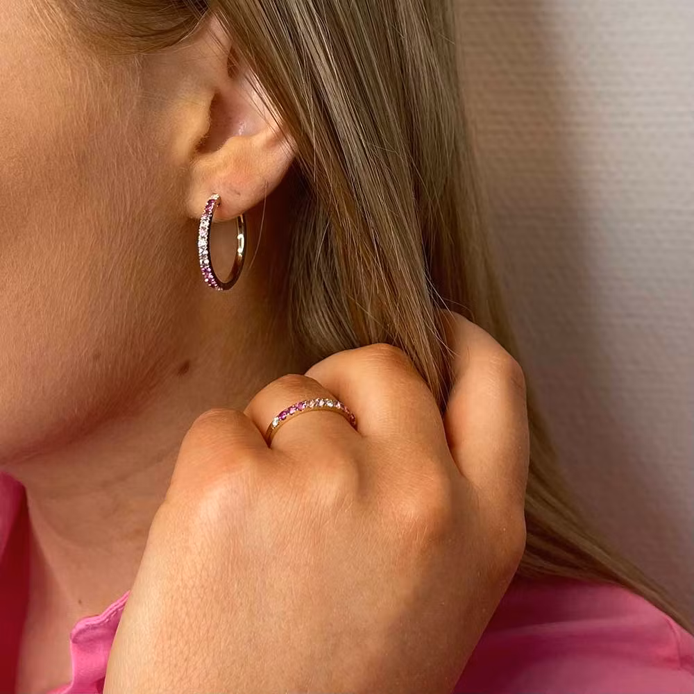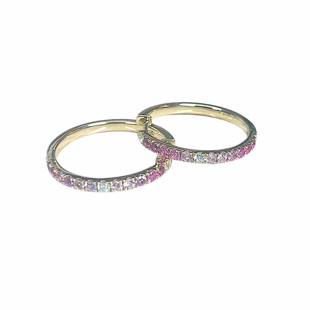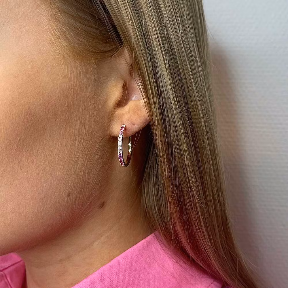 Magiskt vackra creoler i återvunnet 18 karats guld med mängder av gnistrande diamanter & safirer i flera olika vackra rosa nyanser.