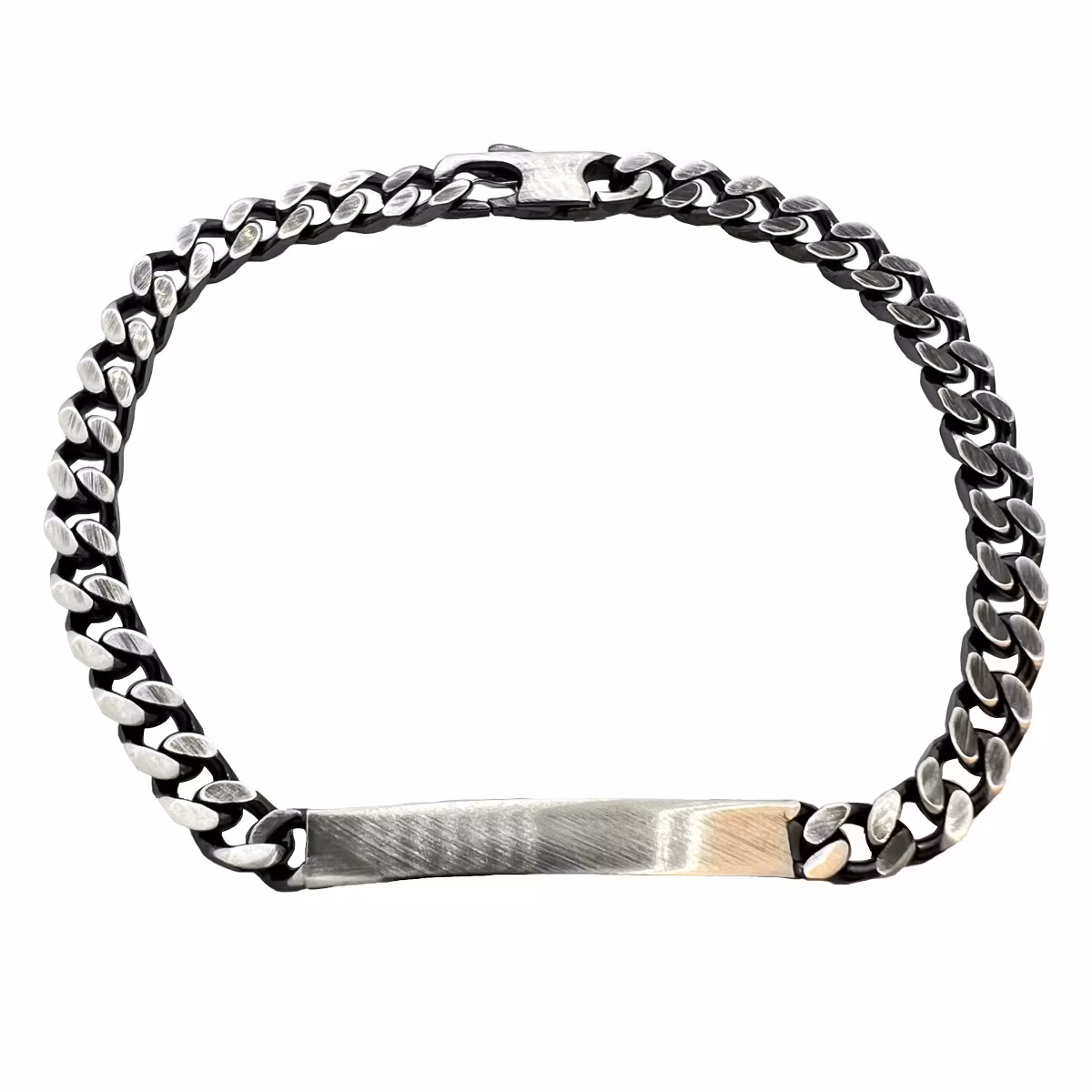 Stilren pansarlänk med gravyrplatta i 925 återvunnet oxiderat silver med fransk karbinhake. Armband av stilren, modern och italiensk design som passar för alla tillfällen, till vardags och fest. Armbandet levereras i en vacker smyckesask. Asken är perfekt för trygg förvaring eller om du ska ge bort smycket i gåva.