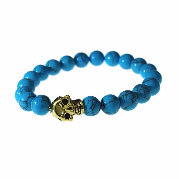 Coolt Dödskallearmband. Turkosfärgade blanka kulor och dödskalle av förgyllt stål. Justerbar storlek.