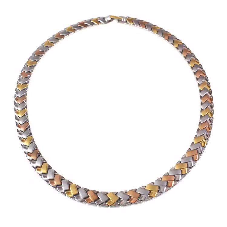 Vackert trefärgat collier i rostfritt stål. Stilrent halsband som passar för alla tillfällen.