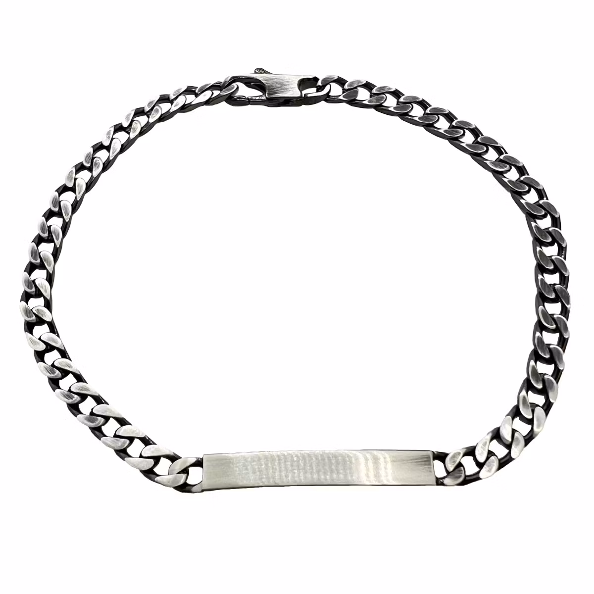 Stilren pansarlänk med gravyrplatta i 925 återvunnet oxiderat silver med fransk karbinhake. Armband av stilren, modern och italiensk design som passar för alla tillfällen, till vardags och fest. Armbandet levereras i en vacker smyckesask. Asken är perfekt för trygg förvaring eller om du ska ge bort smycket i gåva.