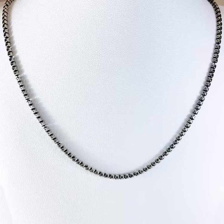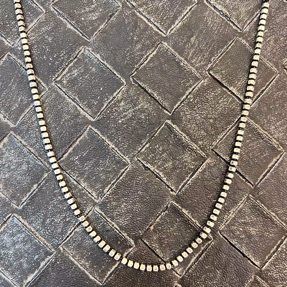 Stilren fyrkantig kulkedja i återvunnet 925 oxiderat silver. Halsband av klassisk och italiensk design som passar för alla tillfällen. Smycket levereras i en snygg smyckesask. Asken är perfekt för trygg förvaring eller om du ska ge bort smycket i gåva. Mät gärna din längd som passar dig bäst innan du lägger din beställning. Den vanligaste längden är 50 och 55 cm. Din perfekta längd beror förstås på hur långt ner du vill att din halskedja ska hänga och hur din kroppsbyggnad ser ut.
